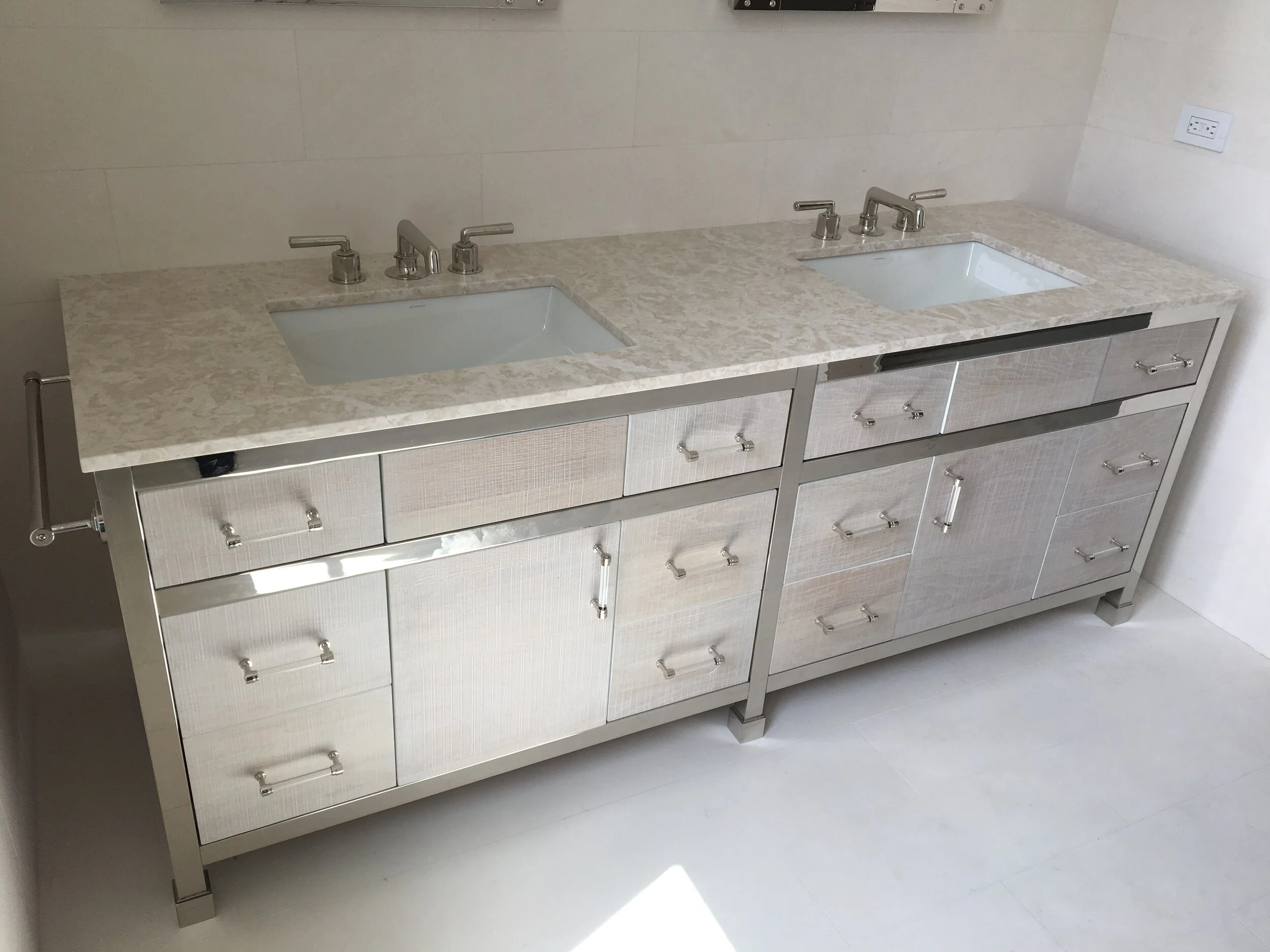 with custom made polished nickel framing and a storage shelf below