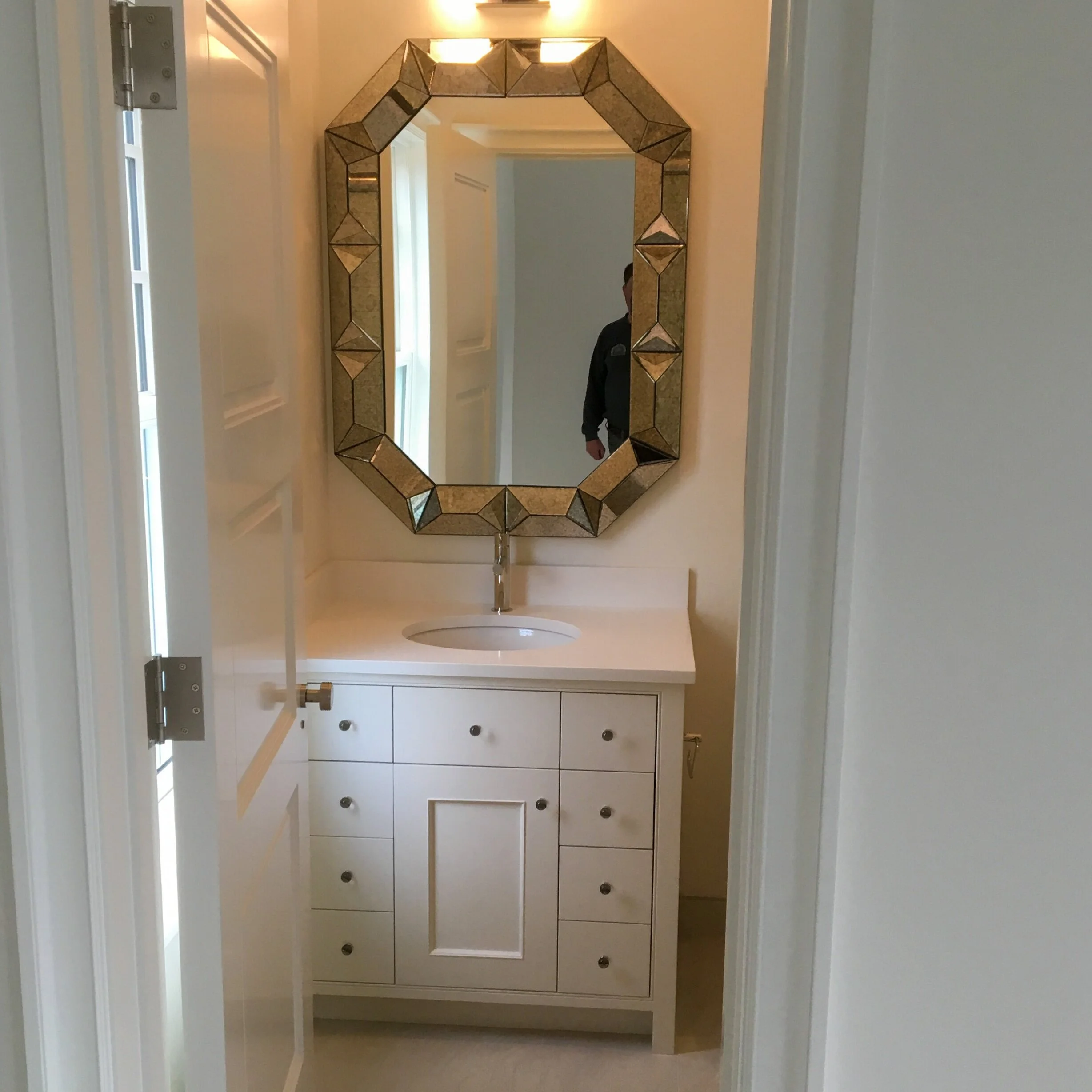 White apothecary style vanity